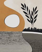 Minimalistische illustratie van een gestileerde boom vroeg in de ochtend. De tweedeling van de scene benadrukt het contrast van het licht van de opkomende zon en de schaduwen van de nacht, die zich niet graag laten verdringen. De kleuren zijn beperkt tot orange, varianten van grijs-bruin en antraciet. Daardoor en door de horizontale lijnen op de voorgrond heeft het landschap een rustige en vredige uitstraling.