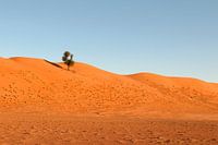En terwijl we over het zand lopen zie ik ineens deze boom. Een niet te grote, maar zeker ook niet kleine, boom op een zandhelling van een duin in de woestijn. En meteen schieten er duizend vragen door mijn hoofd. Wie heeft die boom daar neergezet? Of heeft zaad zelf deze plek gevonden? Waarom staat hij hier zo alleen? En hoe overleeft hij het woestijnklimaat? Geeft iemand hem misschien water en zo ja, waarom?