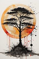 Een abstract aquarel van een eenzame boom, met daar omheen een draaiende cirkel van oranje rode gekleurde inkt. Het geeft een sprookjesachtig effect met de boom als middelpunt. De afbeelding is gegenereerd met ai.