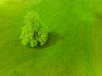 Zicht van boven op een boom in een frisgroene weide in de Logar vallei (Logarska dolina) in de Kamnik Savinja Alpen in Slovenië tijdens een mooie lentedag met de Rinka watervallen.