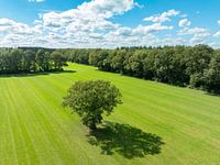 Eikenboom in een vers gemaaid weiland tijdens een mooie zomerdag in aan de rand van de Veluwe in Gelderland, Nederland, van bovenaf gezien