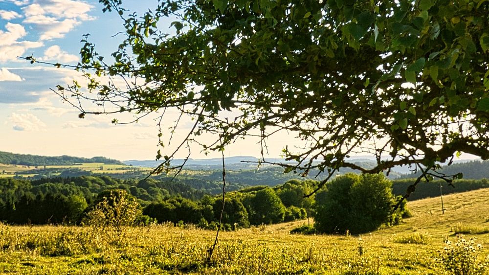 Boom in een weiland bij zonsondergang. Landschapsfoto van het Saarland.