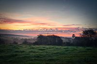 Boom in een weiland bij zonsopgang. Koel herfstlandschap. Mystieke sfeer. Landschapsopname van het Saarland.