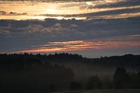 Boom in een weiland in de mist bij zonsopgang. Koel herfstlandschap. Mystieke sfeer. Landschapsopname van het Saarland.
