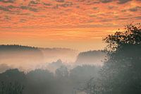 Boom in een weiland in de mist bij zonsopgang. Koel herfstlandschap. Mystieke sfeer. Landschapsopname van het Saarland.