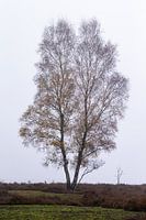 Een alleenstaande boom staat in de mist en in herfstsferen in het Nederlandse landschap.