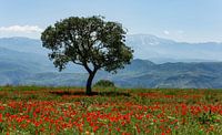 Boom in oranje klaprozenveld in de natuur en bergen van Iran.