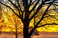 Mooi donkere stam van de boom, tegen het kleurrijke ochtend licht tijdens de zonsopkomst, met een laagje grondmist