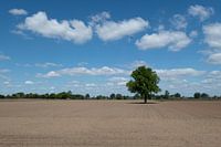 Een eenzame boom op een strak omgeploegde akker in het Noord-Brabantse Vierlingsbeek. Een blauwe lucht met enkele witte schapenwolkjes.