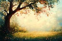 Boom kleuren | Zonnig landschap met bloemen - Op dit landschap schilderij zie je een mooie boom met kleurrijk bladerdek en een zonnige achtergrond vol zachte kleuren tussen een groene grasvlakte en kleurrijke bloemen.