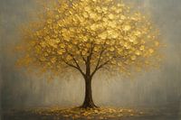 Een solitaire boom met glinsterende, goudkleurige bladeren staat centraal tegen een zachte grijsblauwe achtergrond. Het stevige silhouet van de stam vormt een mooi contrast met de fonkelende bladerkroon, terwijl verspreide blaadjes op de grond een subtiele beweging suggereren. Het licht lijkt te dansen over de metallic glans, waardoor…