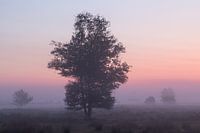 Deze boom op de heide is goed voorbereid op de komende regen. Het lijkt net alsof hij laarsjes aan heeft. Op de achtergrond kleurt de lucht mooi oranje. De mist zal optrekken.