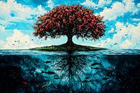 Dit prachtige ontwerp toont een indrukwekkende boom met rode bladeren die zich uitstrekt boven een helderblauw wateroppervlak. Onder het wateroppervlak zijn de boomwortels zichtbaar, omringd door kleurrijke vissen die vrij zwemmen. Het schilderij combineert een surrealistische sfeer met levendige kleuren en een intrigerende balans…