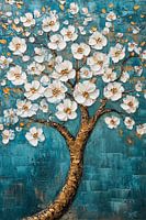 Dit schilderij straalt elegantie en rust uit door de prachtige combinatie van een robuuste boomstam met verfijnde witte bloesems. Het ontwerp maakt gebruik van rijke texturen en kleuren: de achtergrond is een rustgevende turquoise tint, terwijl de goudkleurige accenten de witte bloemen laten stralen. Dit kunstwerk is perfect om een gevoel van natuur en harmonie in je interieur te brengen. Ideaal voor moderne woonkamers, kantoren of slaapkamers, het voegt een vleugje verfijning toe aan elke ruimte. De details in de bloesems en de subtiele gelaagdheid van kleuren maken het een tijdloze en stijlvolle keuze voor liefhebbers van moderne kunst en natuur.