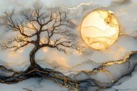 Dit prachtige ontwerp combineert natuurlijke elementen met een abstracte, moderne stijl. De centrale boom, met sierlijke, kale takken, wordt omlijst door een achtergrond van marmerachtige texturen, waardoor het geheel een luxueuze uitstraling krijgt. De goudkleurige accenten geven het geheel een subtiele glans, wat het perfect maakt voor een moderne of minimalistische ruimte. De zon op de achtergrond, die lijkt op een gouden cirkel, voegt een rustgevend element toe, waardoor het ontwerp ideaal is voor ontspannende ruimtes zoals een slaapkamer of kantoor. Dit unieke stuk voegt een vleugje elegantie en rust toe aan elke ruimte.