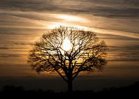 Sfeervolle afbeelding van een prachtige boom gefotografeerd met de zon schijnend door de takken. Geeft een mooi effect in aardse tinten, zoals bruin, terra, zwart, oranje, geel en wit. Passend bij diverse interieurs en trends, zoals botanisch, werelds, world of wonders, natuur, industrieel etc.