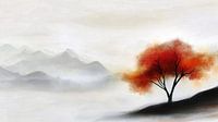 Een enkele rode boom staat imposant op een heuvel en kijkt uit over een met mist gevulde vallei met zachte, mistige bergen op de achtergrond. Deze illustratie ademt een rustige sfeer uit en geeft een gevoel van eenzaamheid en vredige afzondering in de natuur.