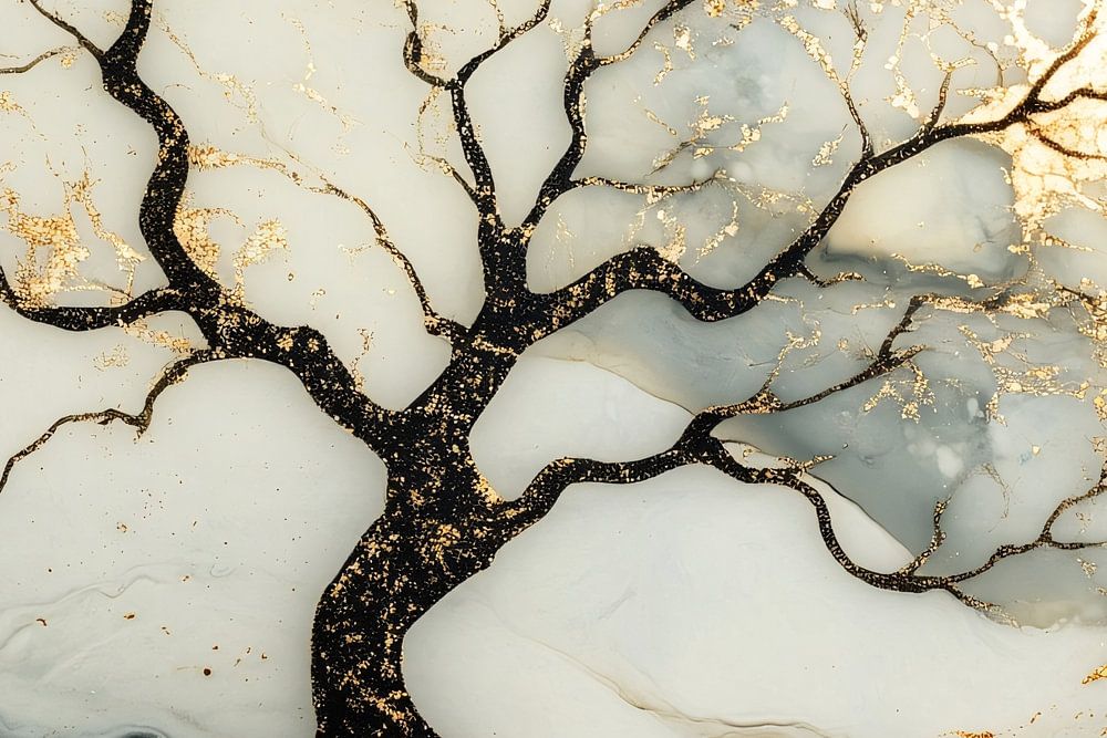 Dit prachtige ontwerp combineert de elegantie van natuurlijke vormen met een moderne, abstracte twist. De boom in het midden van het beeld spreidt zijn takken sierlijk uit, waarbij goudkleurige accenten opvallen tegen een rustgevende, marmerachtige achtergrond in zachte tinten van wit, grijs en beige. Het contrast tussen het donkere silhouet van de boom en de lichte achtergrond, verrijkt met subtiele goudtinten, creëert een fascinerend visueel effect. Deze kunstwerkstijl is perfect geschikt voor een moderne of minimalistische inrichting, ideaal om een vleugje luxe en verfijning toe te voegen aan elke ruimte. Het ontwerp straalt een gevoel van rust uit, terwijl het ook een gespreksonderwerp kan zijn vanwege de unieke combinatie van abstractie en natuurlijke elementen.