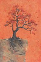 Dit werk toont een eenzame boom die op een rotswand staat, zijn wortels diep verankerd in steen. De achtergrond is een warme oranje gloed, waarin subtiele spatten en textuur zichtbaar zijn. De donkere stam en vertakkingen contrasteren scherp met de achtergrond, waardoor de boom krachtig en fragiel tegelijk oogt.