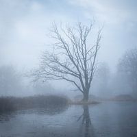 Boom reflectie in de mist op de Empese en Tondense heide in Nederland.