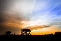 Silhouet van een boom bij zonsondergang op de Groote Peel in Limburg en Noord-Brabant. Warme blauwe en oranje tinten.