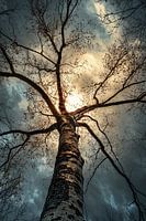 Deze prachtige foto toont een dramatisch perspectief van een boom, gefotografeerd vanuit een laag standpunt, met een adembenemende lucht als achtergrond. De krachtige contrasten tussen de donkere bast van de boom en het warme licht dat door de takken straalt, zorgen voor een dynamisch en intrigerend beeld. Ideaal voor interieurs die een…