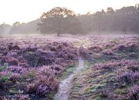 Op een mistige en bloeiende heide baadt een eenzame boom in het magische ochtendlicht