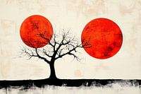 Een zilveren boom knielt in stilte, terwijl twee felrode zonnen de hemel verlichten. Deze fascinerende compositie van contrasten brengt een mystieke energie over die de kamer tot leven brengt. Ideaal voor de woonkamer om een uitnodigende en toch reflecterende sfeer te creëren.