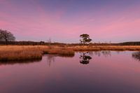 Foto van een naaldboom op het Dwingelderveld in Drenthe. Het is bijna windstil, er is een mooie weerspiegeling in het water. De lucht kleurt roze, aan de andere kant gaat de zon onder. De foto is gemaakt in februari 2023, in Drenthe Nederland.