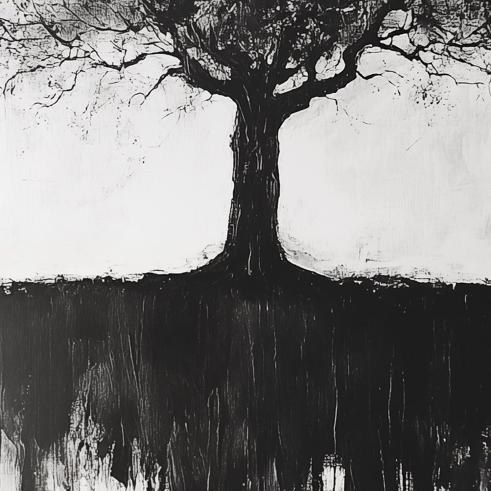 Boom zwart-wit artistiek schilderij dat een prachtige luxe toevoeging zal zijn aan elke ruimte. Met zijn unieke en elegante uitstraling trekt het onmiddellijk de aandacht. De schitterende kleuren en het bijzondere ontwerp maken dit kunstwerk volledig uniek en origineel. Het is de ideale fotoprint om je interieur volledig af te maken.