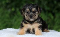 Portret van een 5 weken oude boomer pup, ze heeft diverse kleuren in de vacht en een mooie tekening in het gezicht. Gefotografeerd op een wit wollen dekje tegen een natuurlijk groene achtergrond.