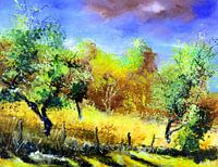 Weelderig groene bomen steken af tegen een goudkleurig veld en een dynamische blauwe lucht. Een rustiek houten hek strekt zich uit over de voorgrond en voegt een vleugje pastorale charme toe aan het landschap.