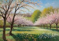 Delicate bloesems barsten in roze en wit uit tegen het frisse groen van een lenteboomgaard. Zacht gedempt licht filtert door de takken, terwijl de zachte streken van de kunstenaar de zoetheid en vernieuwing van de lucht vastleggen. Het tafereel voelt veelbelovend, perfect om frisheid, vreugde en seizoensschoonheid toe te voegen aan elke…
