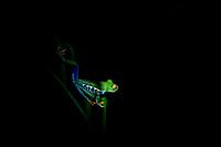 Boomkikker in de nacht op een blad. Klaar om te springen. Genomen tijdens een nachtsafari in Costa Rica.