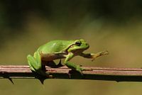 Een groene kikker kruipt tussen de doornen van de bramenstruik