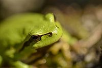 Deze boomkikker verbleef met zijn vele kameraadjes in een meertje in Tsjechië. Hoewel ze in Nederland nog wel eens lang willen blijven zitten, kreeg ik van deze boomkikker nogal weinig tijd. Hij was heerlijk aan het zonnebaden en ik zag mijn kans schoon om een foto te maken. Ik koos voor een zachte bokeh om het kopje van de boomkikker…