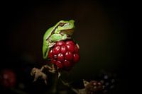 Boomkikker rustend op een rode braam. De boomkikker zit nog net lekker in het zonnetje.