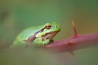 Boomkikker op een tak van een braamstruik. De naald van de stuik laat goed zien hoe klein de kikker is maar ook hoe makkelijk hij zich zou kunnen bezeren.