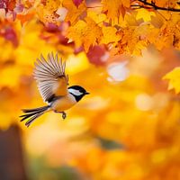 Een klein vogeltje zweeft te midden van gloeiende, gouden bladeren. Zijn levendige kleuren vormen een fascinerend contrast met het warme herfstlandschap. Met elegant uitgestrekte vleugels vangt hij het moment van vrijheid, terwijl de zachte bries zijn vederlichte wezen omhult. Een harmonieus samenspel van natuur en gratie dat de…