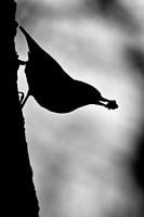 Een silhouet van een boomklever. Het prachtige bosvogeltje heeft een brokje klei in zijn snavel. Dit gebruikt hij om de ingang van het spechtennest dat hij kraakte kleiner te maken.