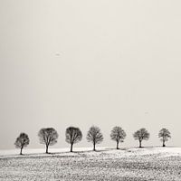Fotografie van een winterboomlaan in minimalistische stijl in zwart-wit.