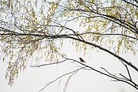 Boompieper zingt zijn lied in een berk met tegenlicht.
