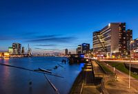Het blauwe uur na zonsondergang bij de skyline van Rotterdam ten hoogte van de boompjes.