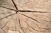 Snijvlak van een afgezaagde boomstam in een park. Op deze al enigszins verweerde boomschijf zijn de jaarringen nog in het hout te zien.