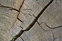 Snijvlak van een afgezaagde boomstam in een park. Op deze al enigszins verweerde boomschijf zijn de jaarringen nog in het hout te zien.