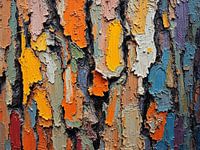 Dit levendige, abstracte kunstwerk vangt de essentie van boomschors door middel van een rijke impasto-techniek. Dikke applicaties olieverf in een caleidoscoop van kleuren - waaronder sinaasappels, geel, blauw, paars, groen en aardetinten - creëren een diep gestructureerd en bijna sculpturaal oppervlak. De sterke verticale streken en…