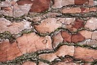 Close up van abstracte lijnen van boomschors van een boom. Warme bruine en rode tinten van de herfst en hout.