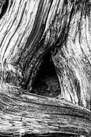 Boomstam hout gedetailleerde textuur close-up gefotografeerd in zwart-wit. Mooie lijnen, vormen en patronen rond de boomholte, gecreëerd door de natuur in het bos.