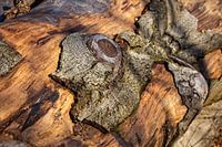 Deze gevelde boom met gedeeltelijk verwijderde boomschors en zachte kleuren levert een voor het oog aantrekkelijk, bijna abstract plaatje op vergelijkbaar met een landschap met eilanden en bossen vanuit vogelperspectief.