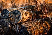 Boomstammen op een stapel in een herfstzonnetje.